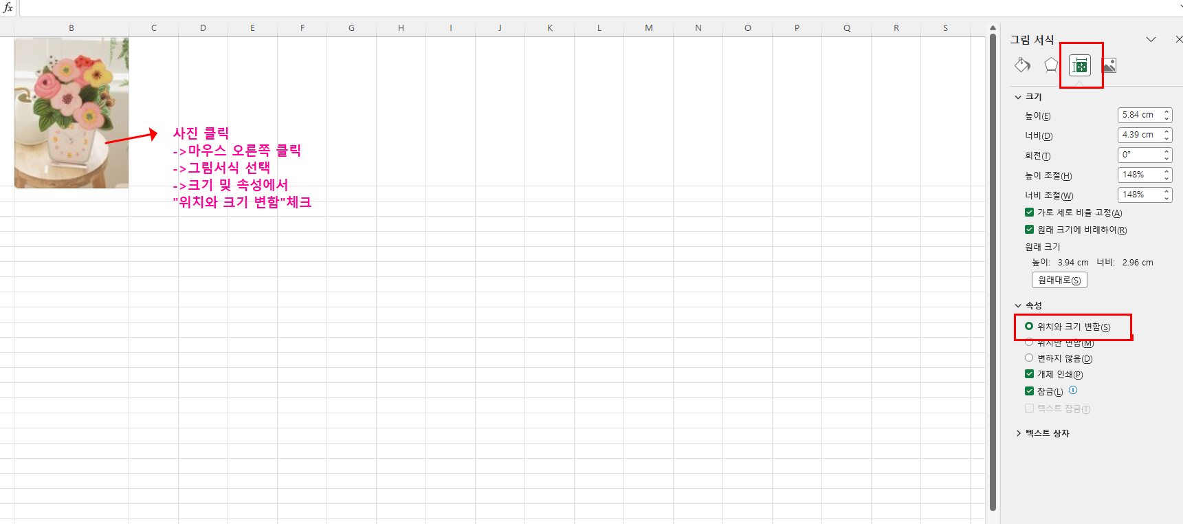 3단계: 사진을 셀과 함께 움직이도록 고정 설정하기